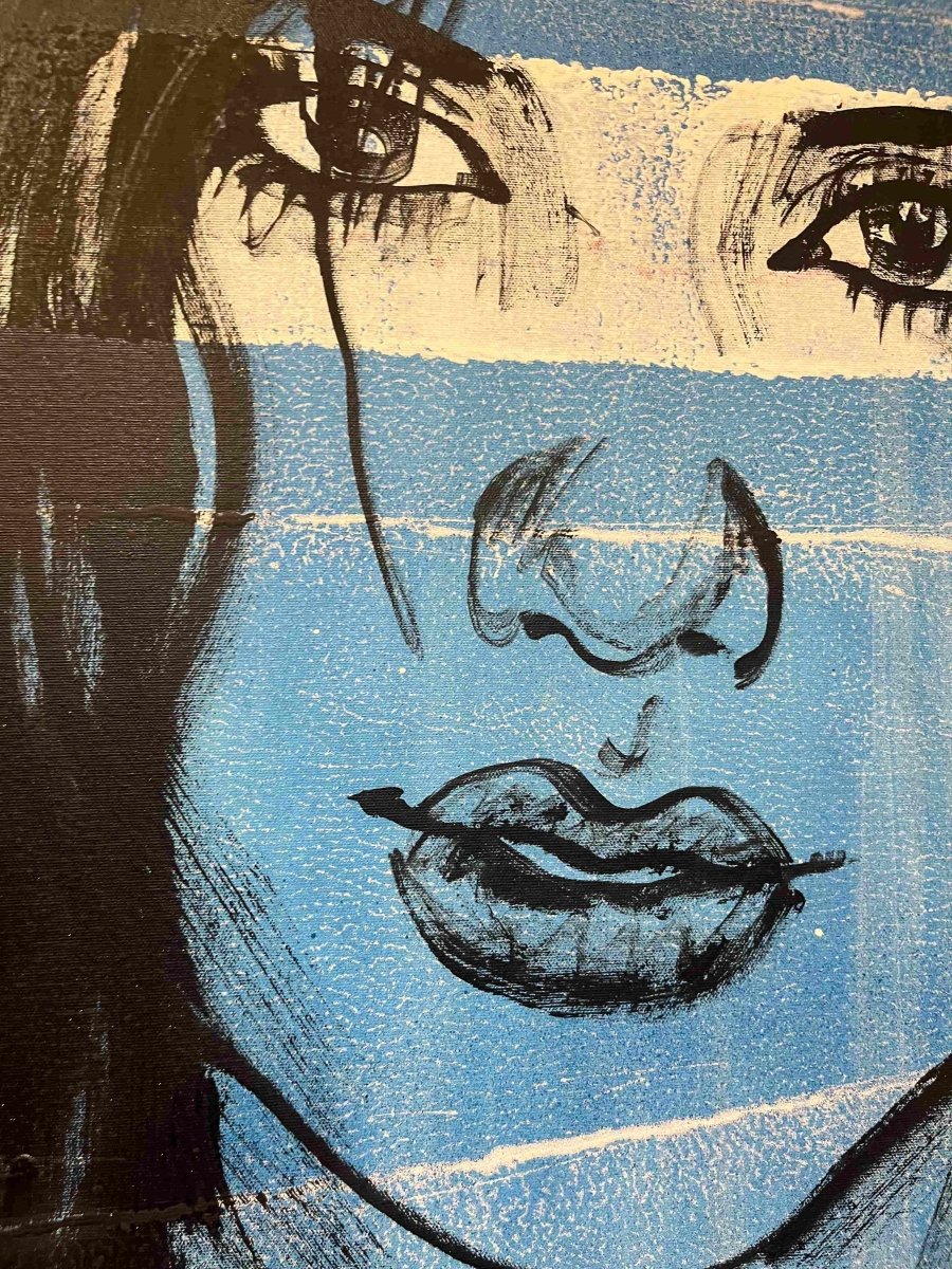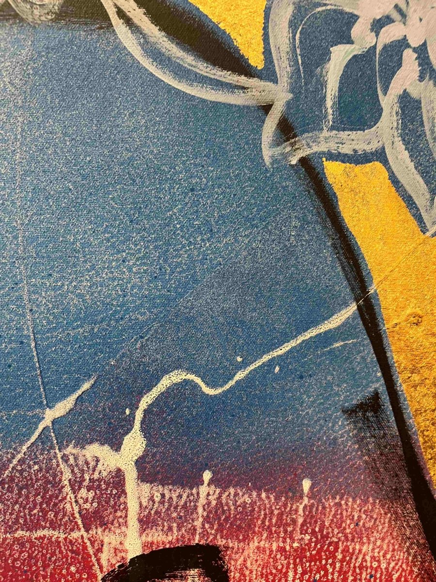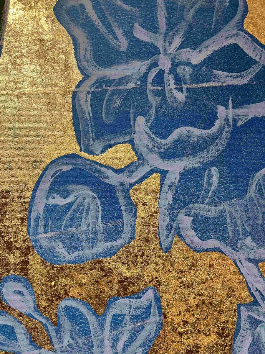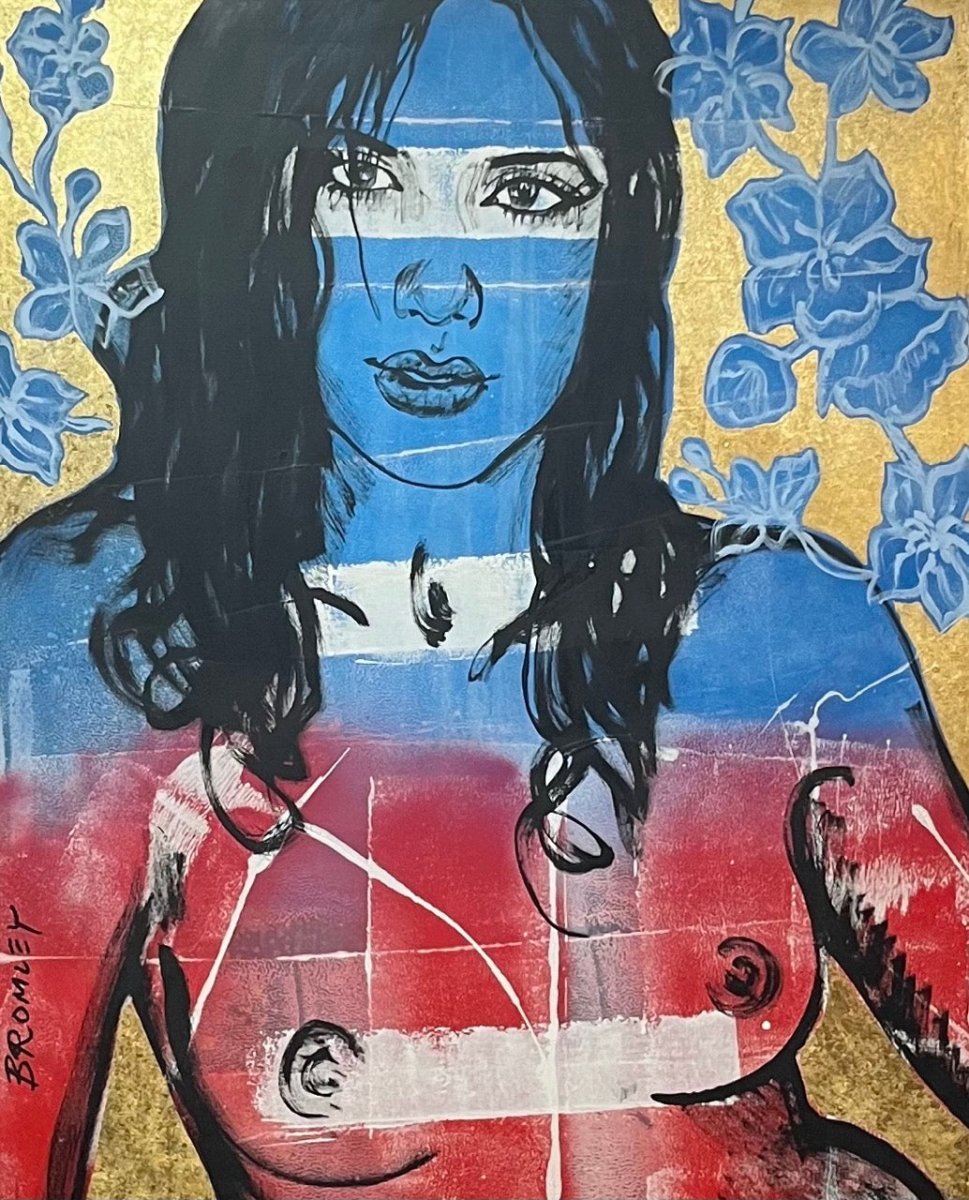 Shipping & ReturnsTerms & ConditionsContactThe striking 'Alexis' from David Bromley's Nude Series. Painted with a combination of punchy blue and red. Complimented by a shimmering gold background. Acrylic on canvas with gold leaf gilding. This painting is located at our Daylesford gallery