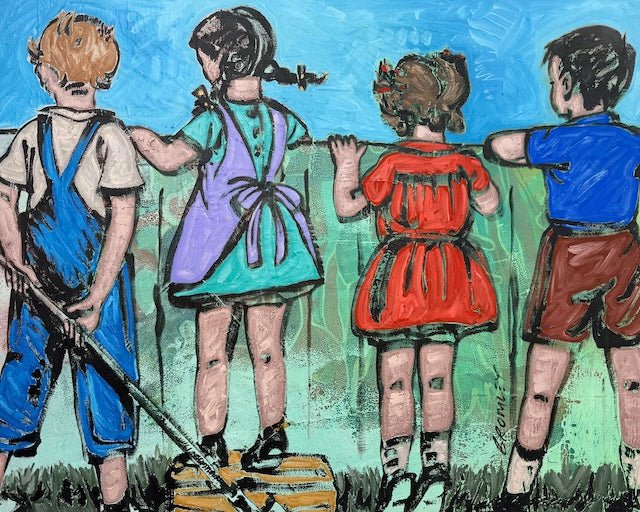 From David Bromley’s Children Series, this playful artwork depicts four children standing side by side, gazing at the world beyond. Bright blues, reds, and greens contrast with a soft sky, while bold outlines and textured brushstrokes add layered depth. The painting captures innocence and camaraderie, blending whimsical storytelling with an expressive style that celebrates childhood wonder, imagination, and moments of connection.