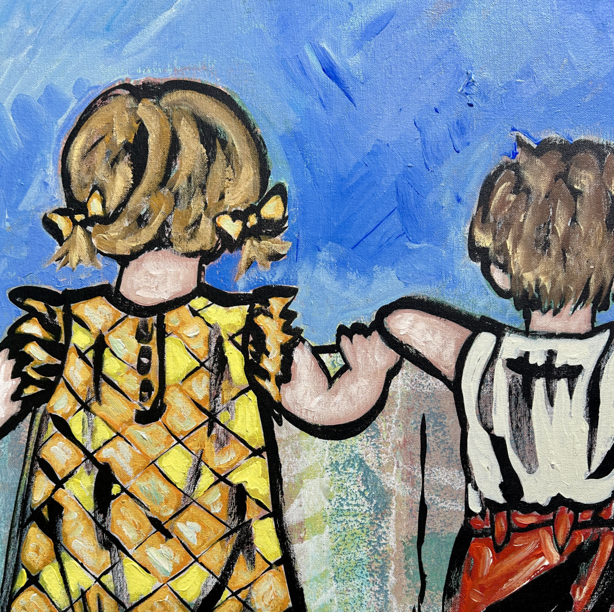 The iconic Over the Fence from David Bromley's Children's Series. Painted with a more vintage style colour palette layered to create depth and texture. Located at David's private studio - to view this piece please click 'enquire now'.
