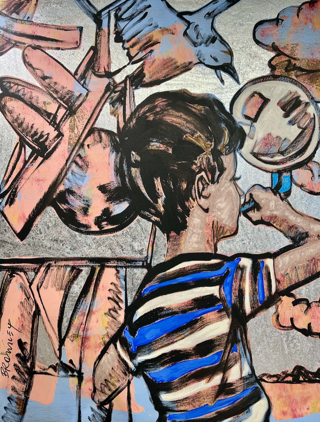 Shipping & ReturnsTerms & ConditionsContactAn original painting from David Bromley's Children's Series. Painted with soft peachy tones and soft blues, complimented by a shimmering silver background. Acrylic, oil and silver metal leafing on canvas. 150 x 120cm. This painting is located at our South Yarra gallery and will be signed prior to delivery.