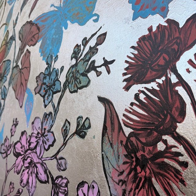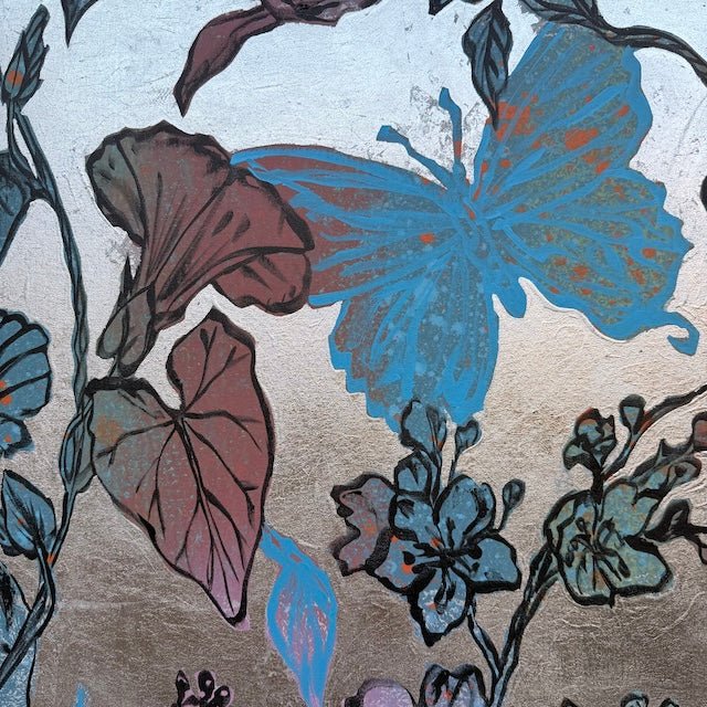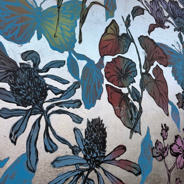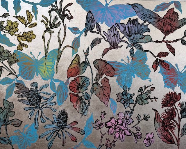 From David Bromley’s Nature Series, this textured painting features flowers, leaves and birds in pale blues, soft yellows and calming, earthy reds. Delicate linework and silhouetted butterflies add movement to the piece, giving the composition a layered, nature-inspired aesthetic. Painted in the same session as ‘Bushland Dreams V’ by David Bromley, these two works pair together beautifully. To arrange a viewing please click, enquire now.