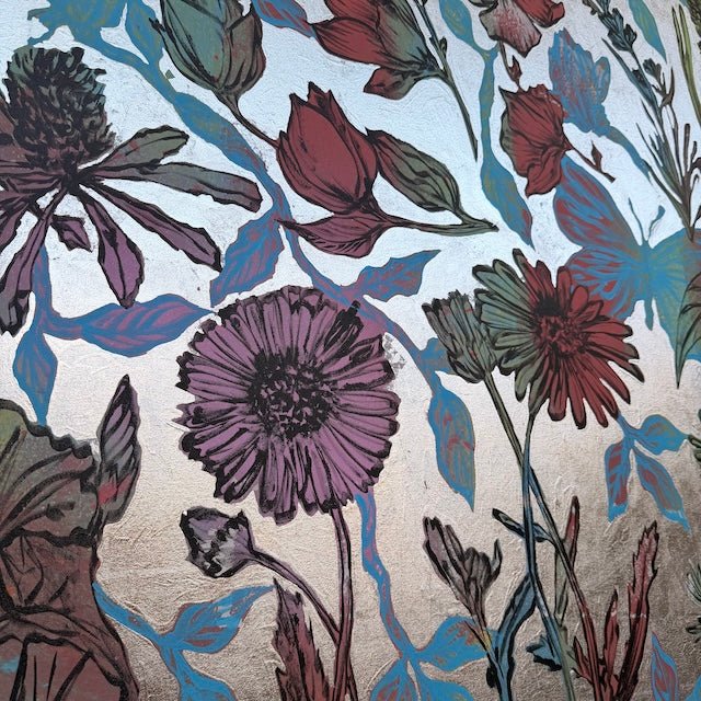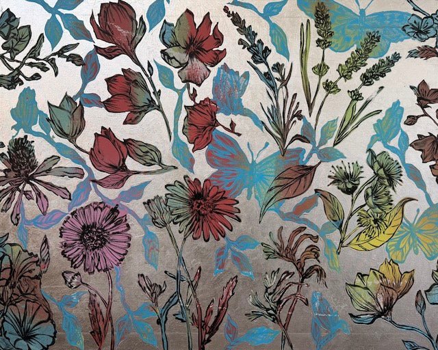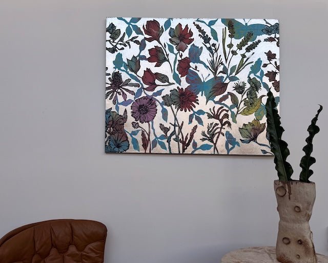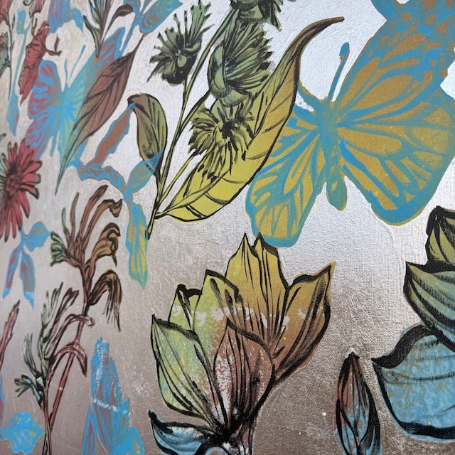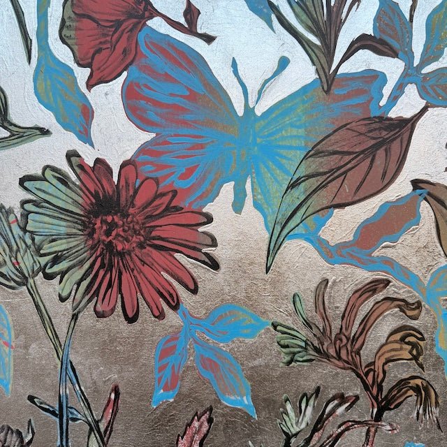 From David Bromley’s Nature Series, this textured painting features flowers, leaves and birds in pale blues, soft yellows and calming, earthy reds. Delicate linework and silhouetted butterflies add movement to the piece, giving the composition a layered, nature-inspired aesthetic. Painted in the same session as ‘Bushland Dreams IV’ by David Bromley, these two works pair together beautifully. To arrange a viewing please click, enquire now.