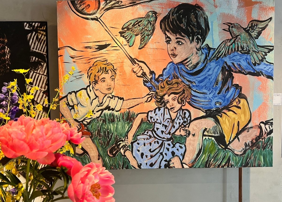 David, inspired by his time surrounded by his gardens, uses birds layered textures and graduated colour to add depth to this work. The warm salmon tones and shades of blue combined with his signature bold graphic lines, make this a beautifully balanced painting.