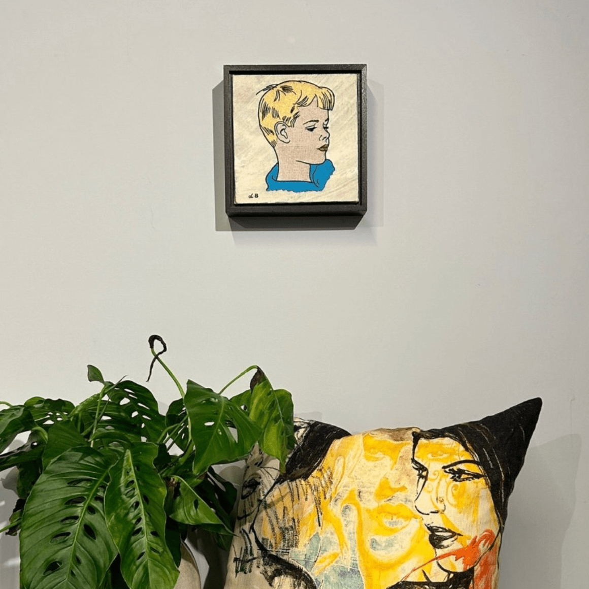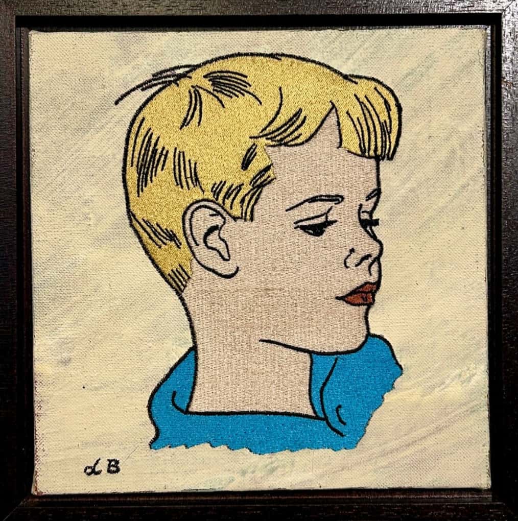 A gorgeous work from David Bromley's nostalgic Children's Series. Cotton thread embroidered onto David's old paint covered drop sheets, framed in timber - 26 x 26cm. This work is located at our South Yarra gallery.