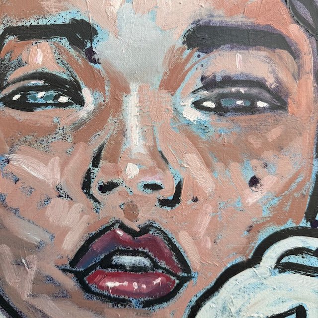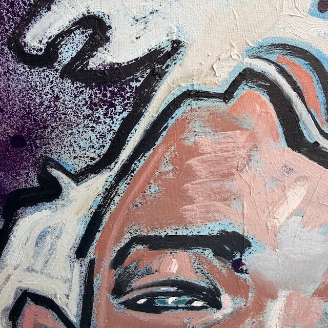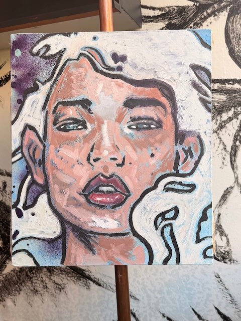 This composition is a a close-up of a stylised face framed by soft, flowing forms, blending abstraction with contemporary portraiture. Warm pinks and earthy tones are layered with cool blues and deep shadows, while bold outlines and textured brushstrokes add depth.
