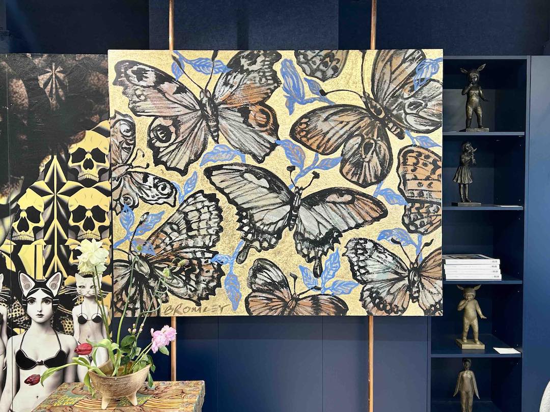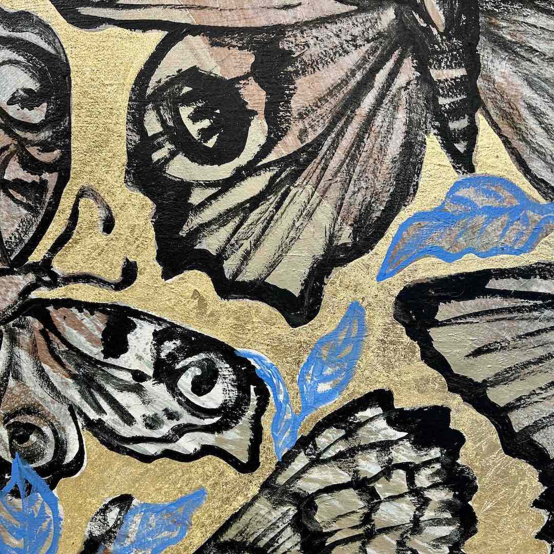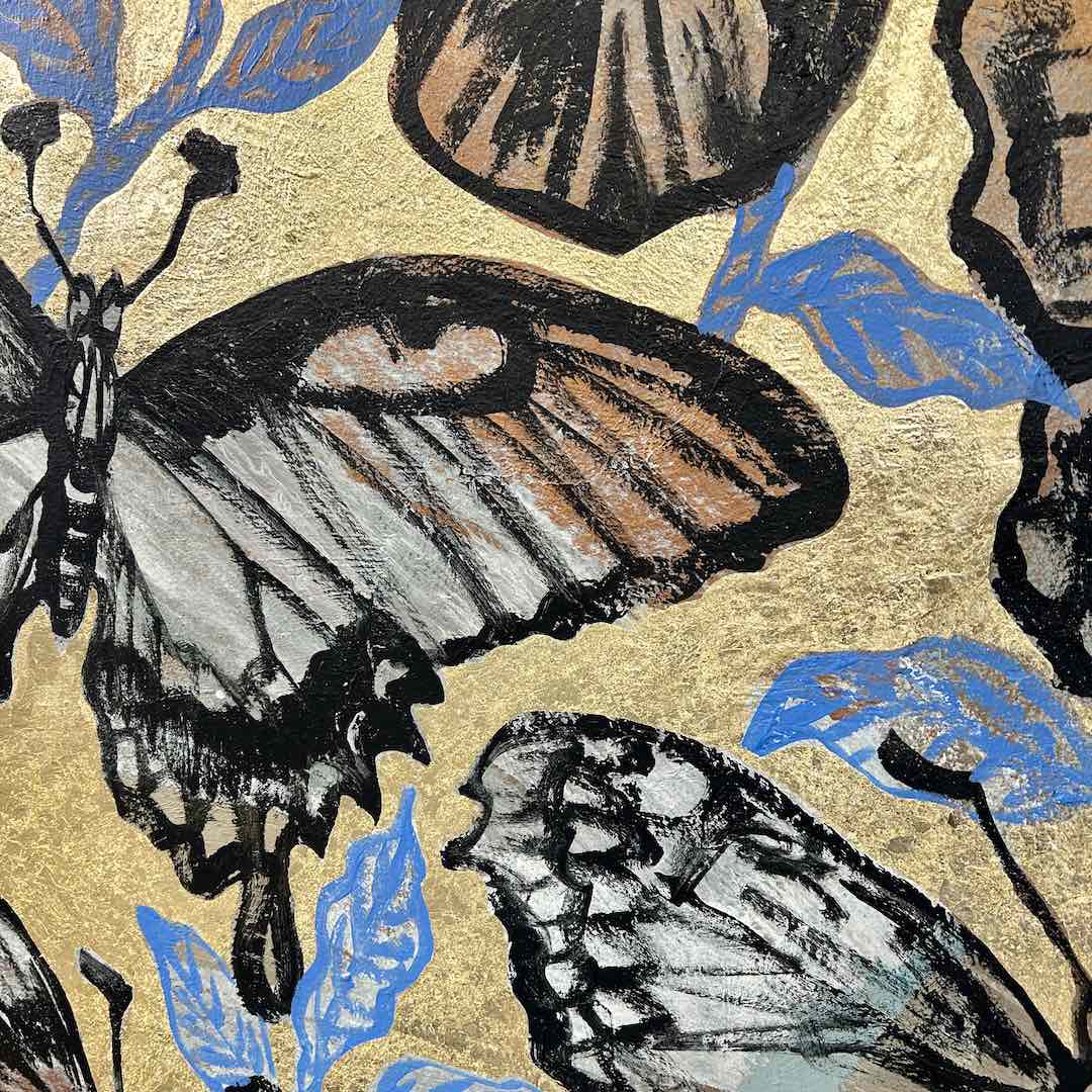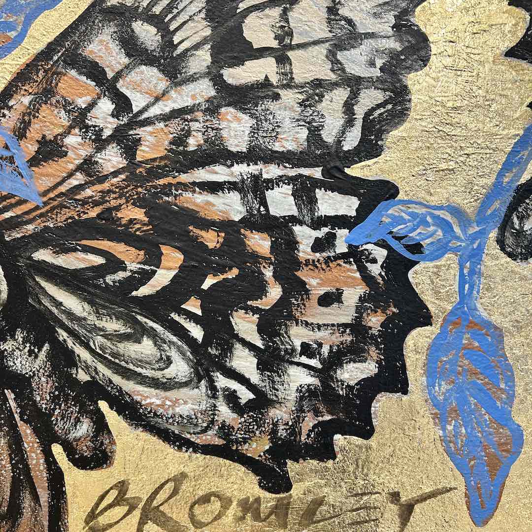 A beautiful Butterfly painting as part of David Bromley's Nature Series. Inspired by his days spent painting outdoors in Byron Bay; surrounded by gardens and butterflies. This piece features layers of bronze tones, with intertwining floral details in a delicate blue, and a warm shimmering golden background. Painted on an old Japanese linen canvas to add texture and charm.