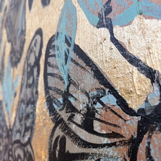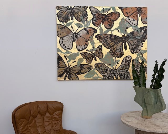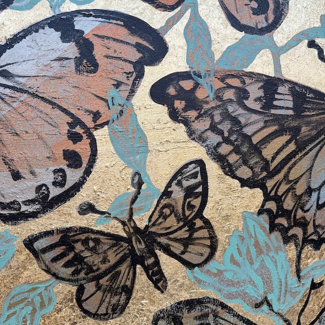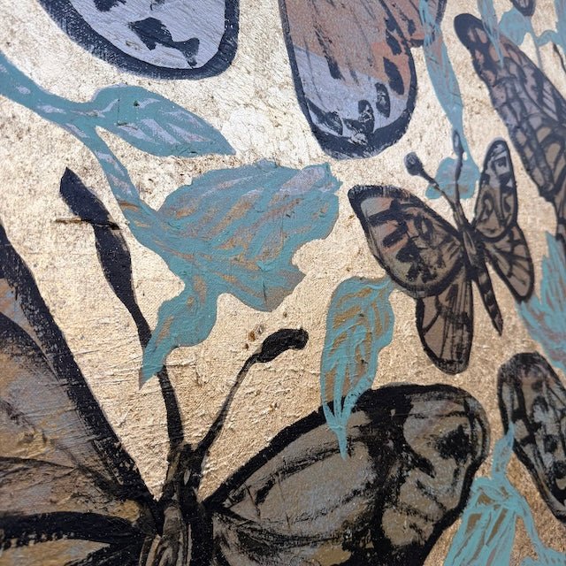 From David Bromley’s Nature Series, this artwork features a collection of intricately detailed butterflies set against a shimmering gold background. Subtle neutrals and warm tones are accented with soft blues, while bold outlines and textured layers create depth. The piece captures a sense of movement and transformation.