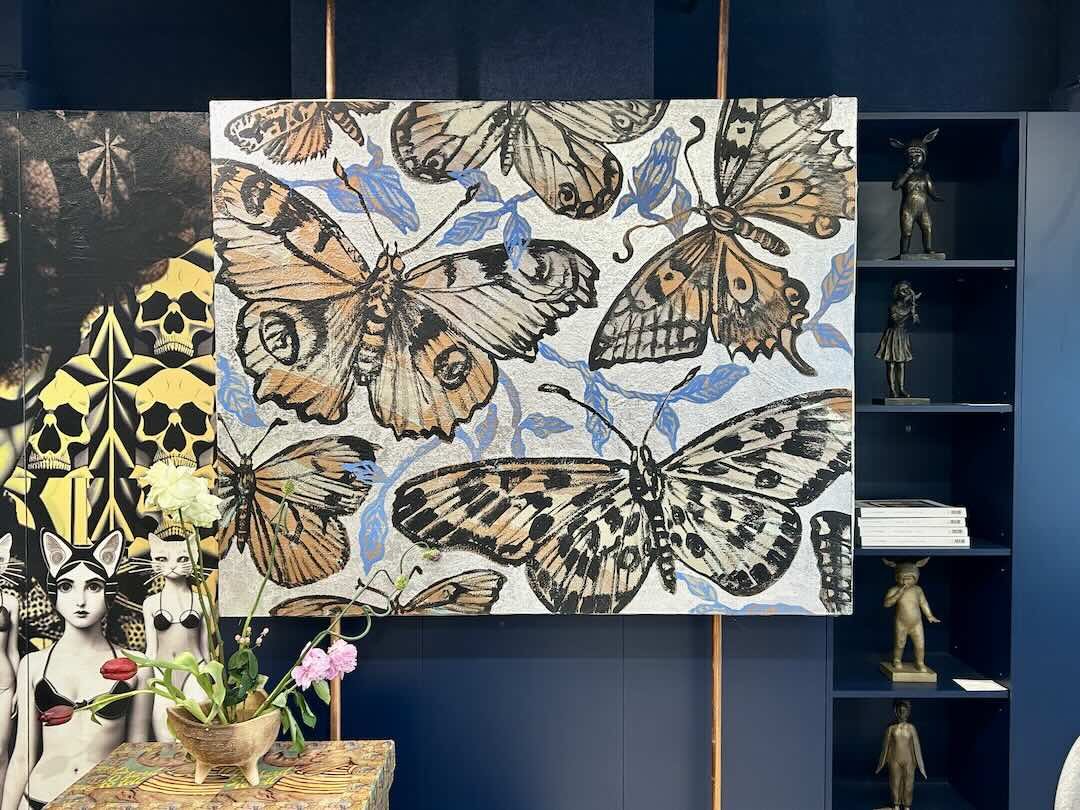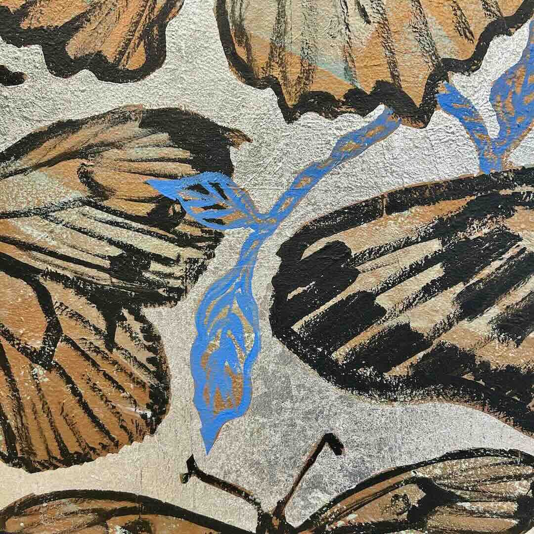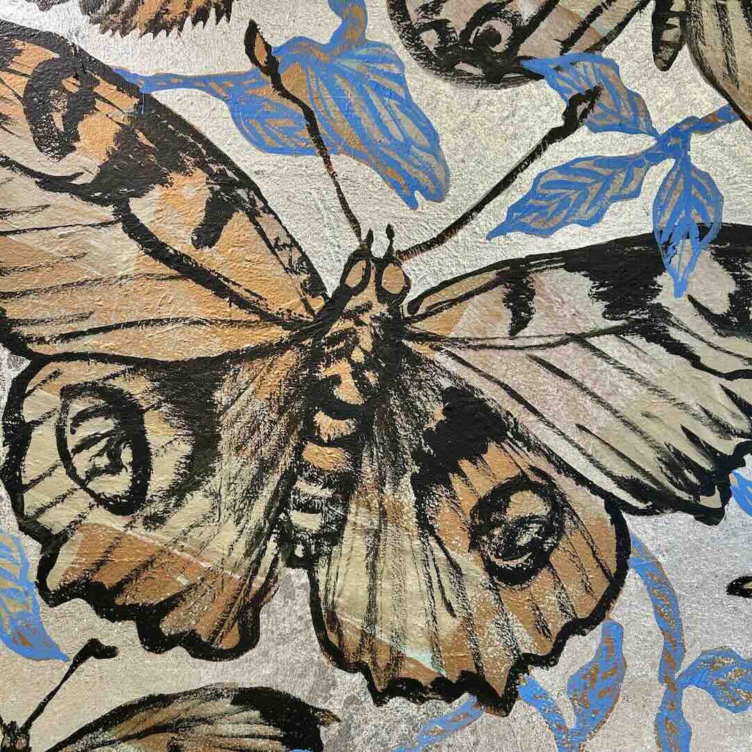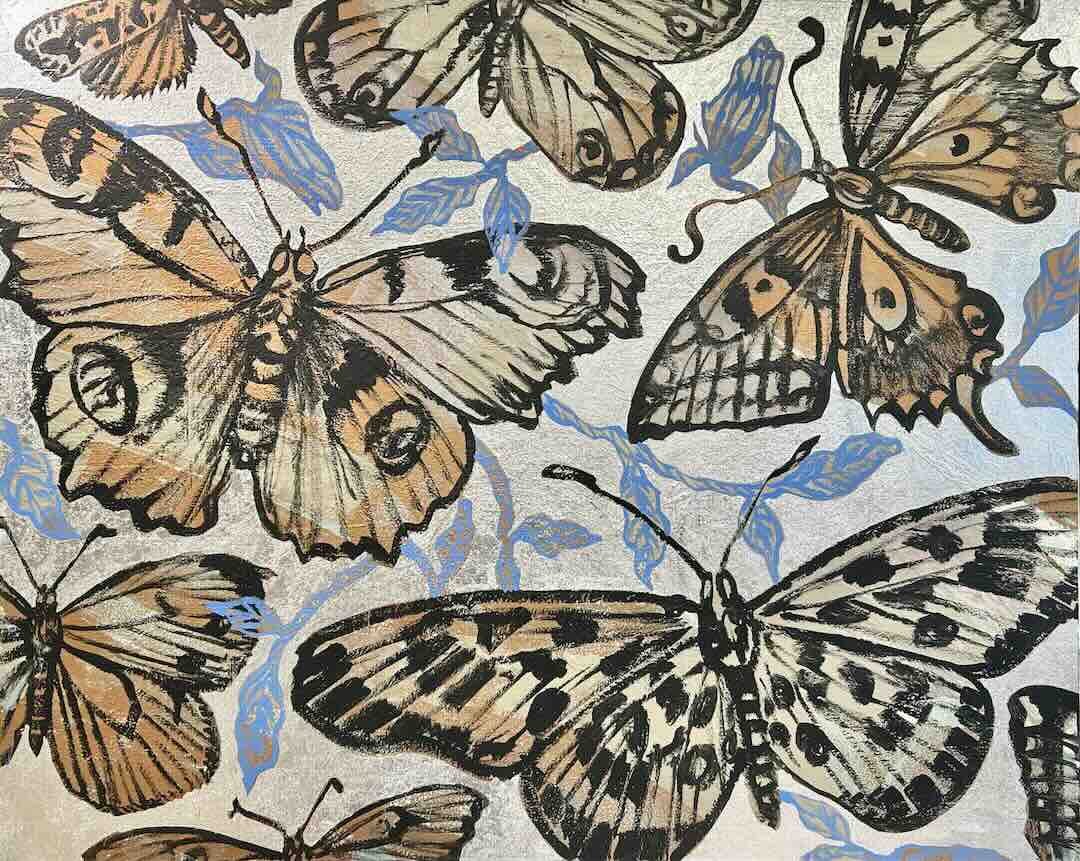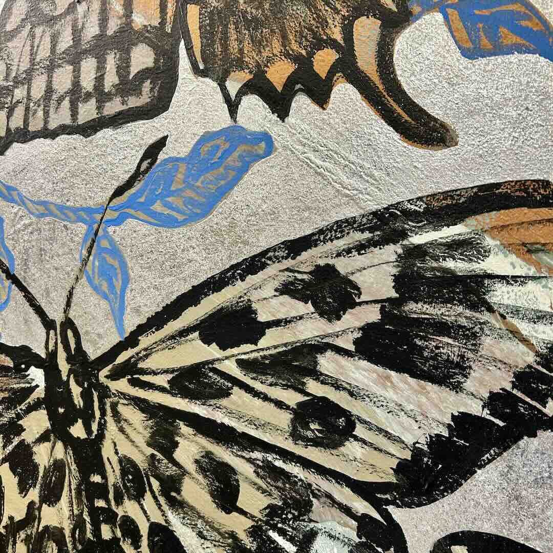 A beautiful Butterfly painting as part of David Bromley's Nature Series. Inspired by his days spent painting outdoors in Byron Bay; surrounded by gardens and butterflies. This piece features layers of bronze tones, with intertwining floral details in a delicate blue, and a shimmering silver background. Painted on an old Japanese linen canvas to add texture and charm.