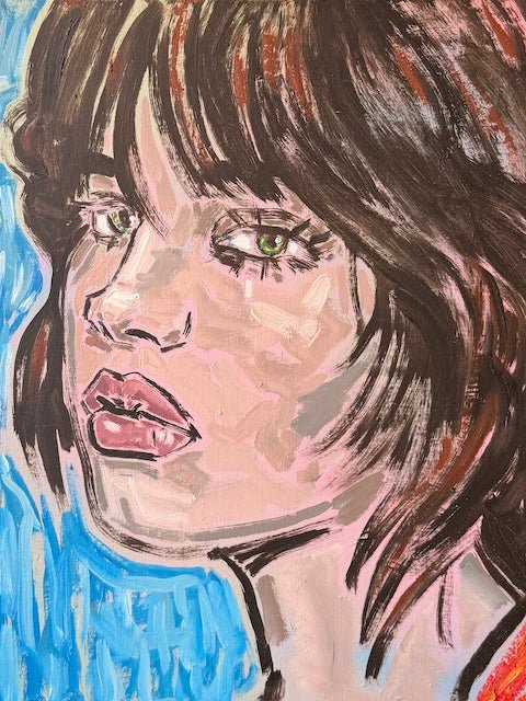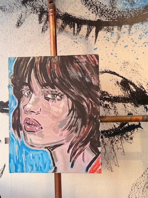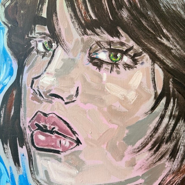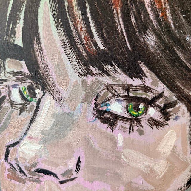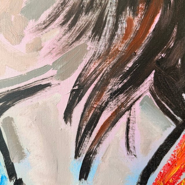 This artwork features a portrait, a moment of quiet intensity. Expressive brushwork and layered tones bring depth to the subject’s gaze, while bold lines and soft colour contrasts reflect the power of vulnerability.