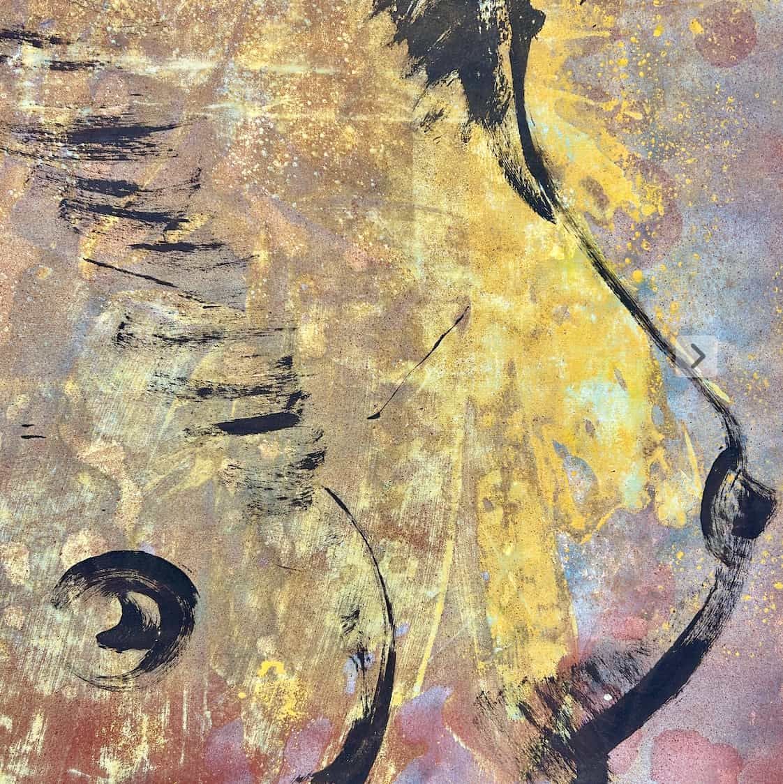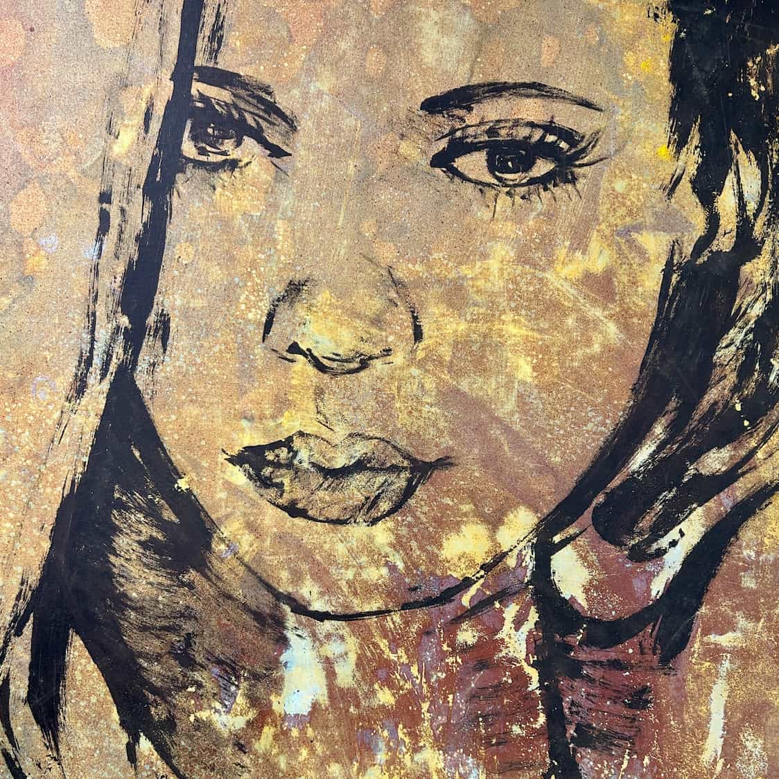 The striking 'Laura' from David Bromley's Nude Series. With a stunning layered and textured background with an array of golden tones. Acrylic and oil on canvas. 180 x 150cm. This painting is located at our South Yarra gallery and will be signed prior to delivery.