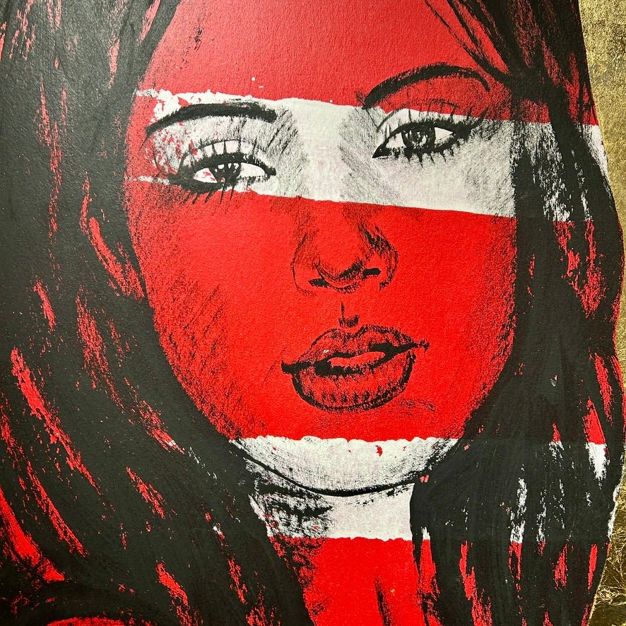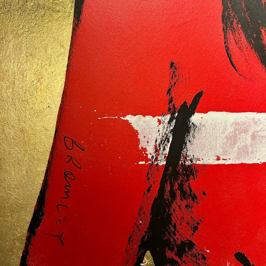 Shipping & ReturnsTerms & ConditionsContactThe beautiful 'Mallory' from David Bromley's Nude Series. Painted with striking red contrasted by graphic white stripes. With a warm, shimmering gold backdrop. Acrylic, oil and gold leaf gilding on canvas. 160 x 122cm. This painting is located at our South Yarra gallery.