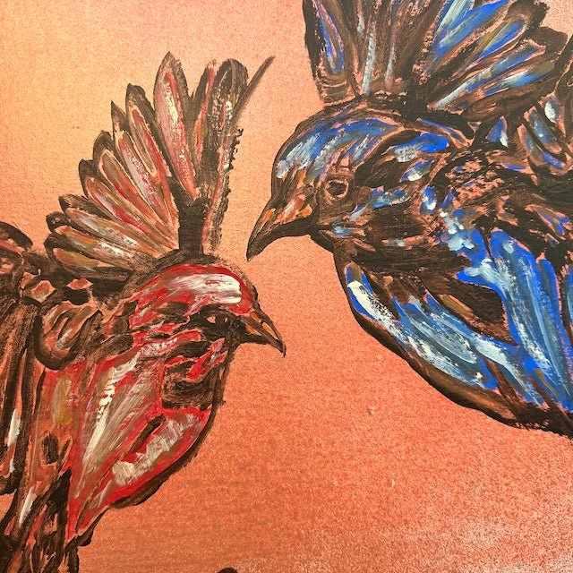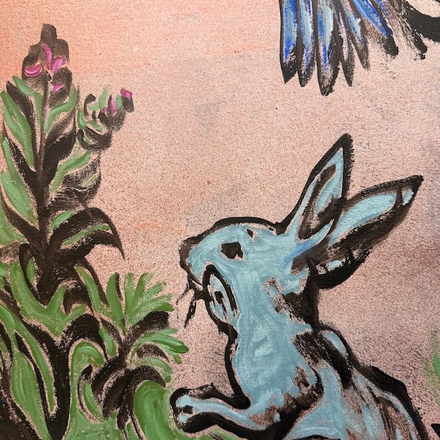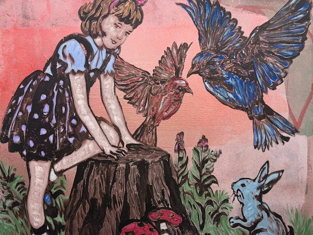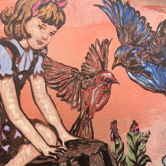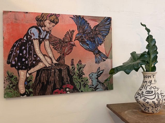 From David Bromley’s Children Series, this nostalgic artwork captures innocence and imagination, depicting a young girl playing with birds in flight and a curious rabbit. Soft pastel tones and expressive linework create a dreamlike world of wonder, nature, childhood magic.