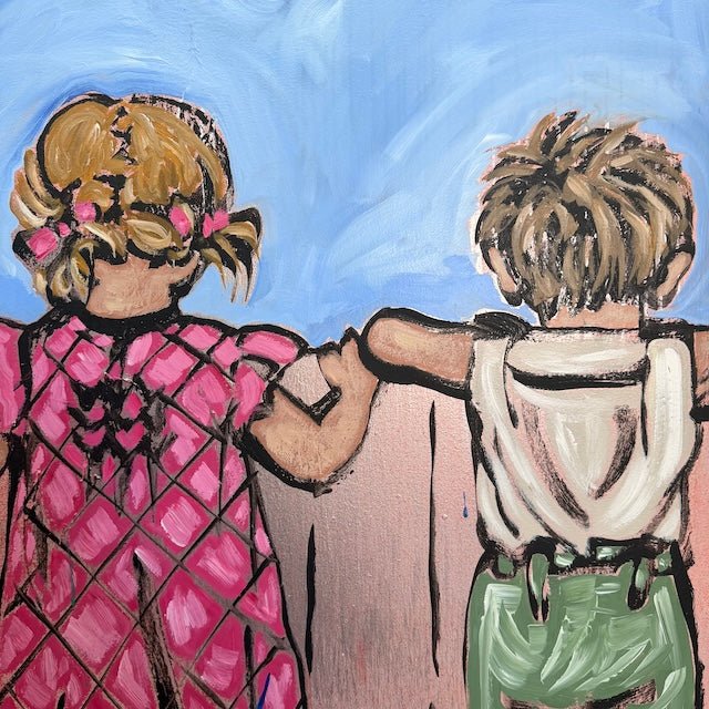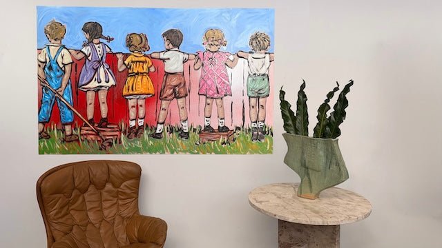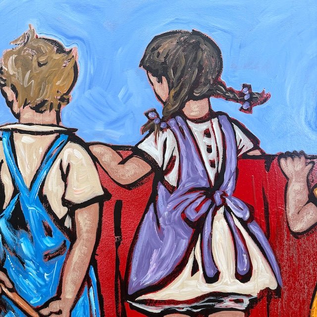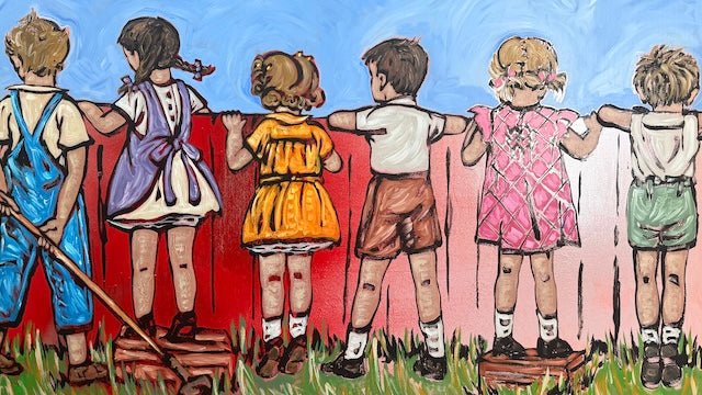 From David Bromley’s Children Series, this nostalgic composition captures a row of children peering over a fence at the world beyond, united in curiosity and companionship. Rich colour and expressive brushwork create a sense of innocence, storytelling, and the shared wonder of childhood discovery.
