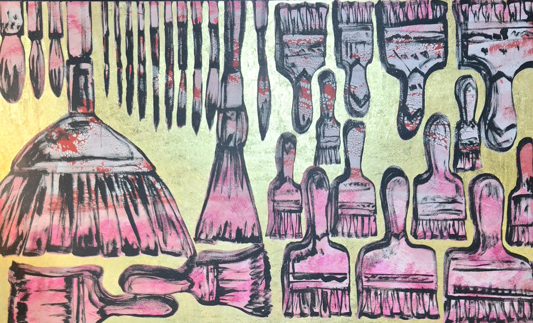 It features a striking repetition of the paintbrushes he frequently uses in his studio, creating a sense of rhythym and artistic intimacy