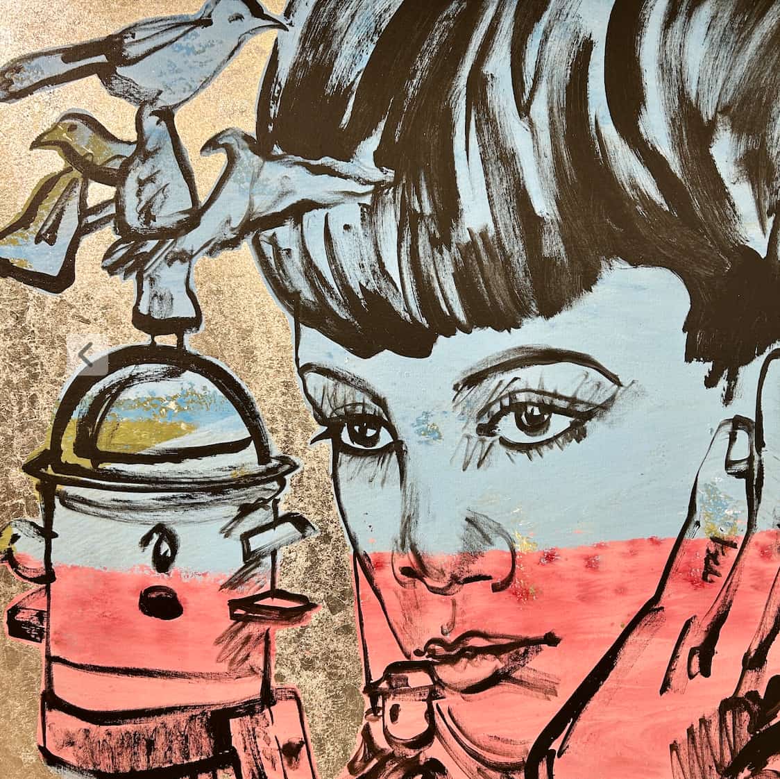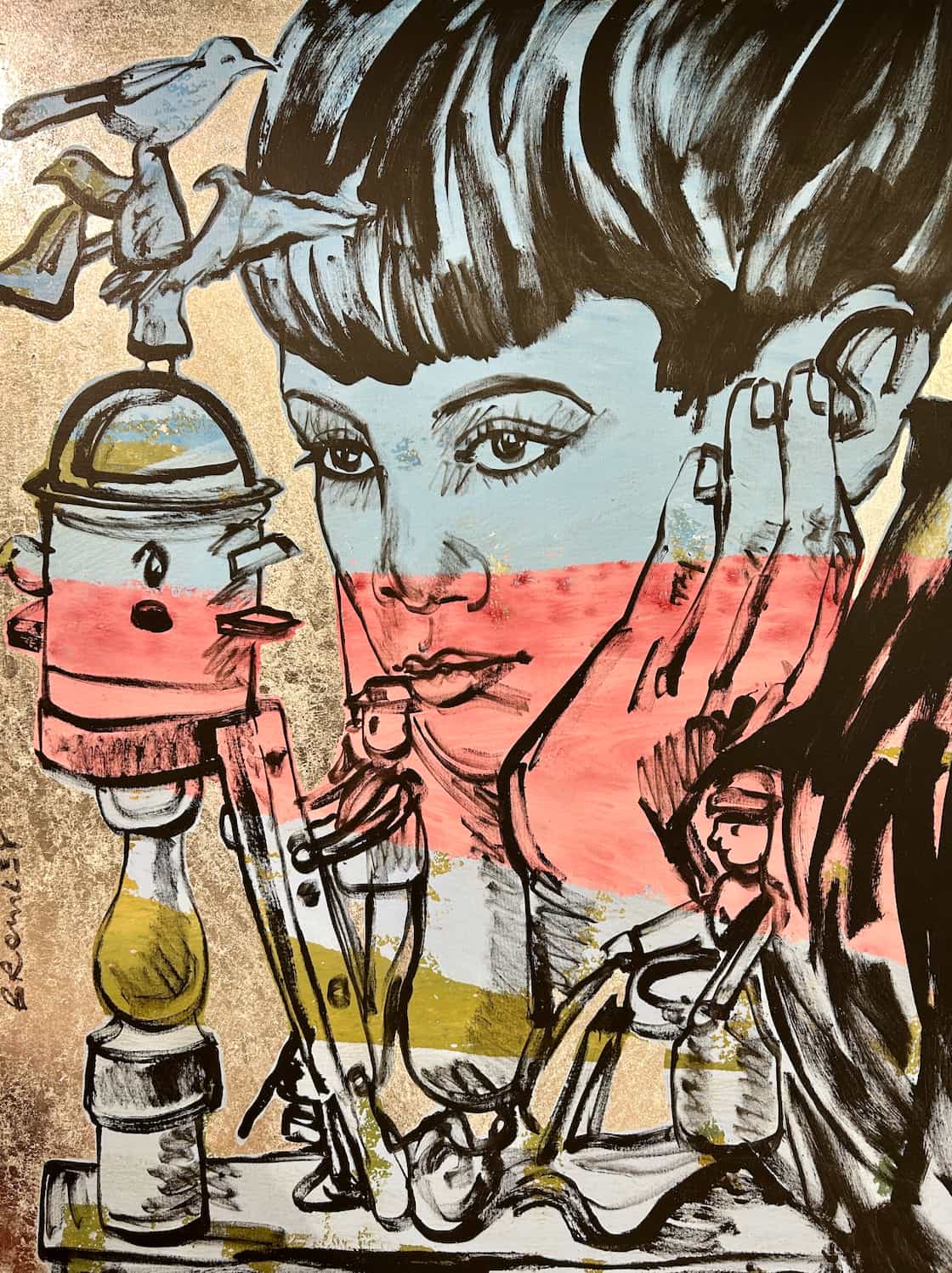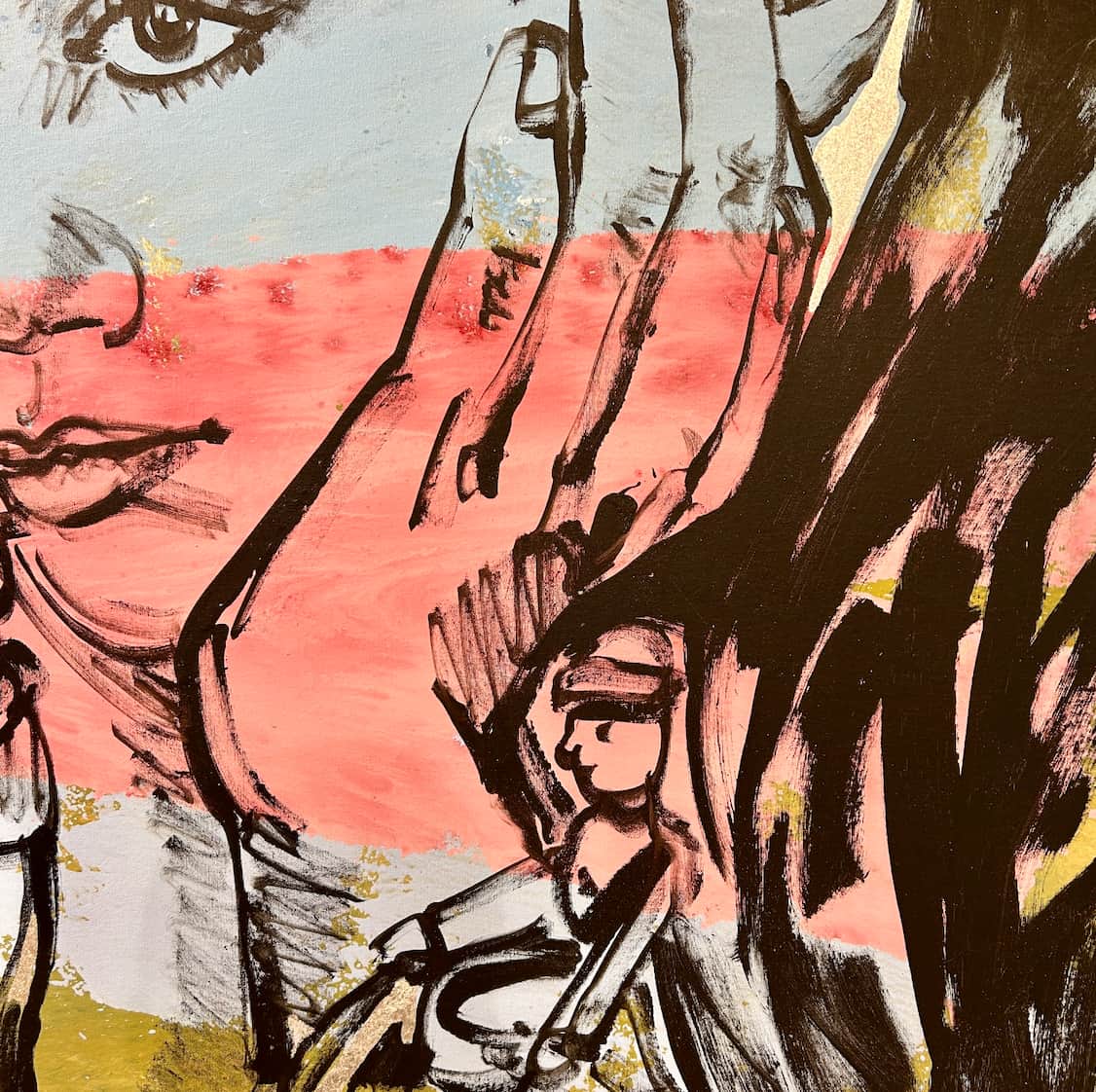 Shipping & ReturnsTerms & ConditionsContactAn original painting from David Bromley's Children's Series. Painted with vibrant pinks and blues, complimented by a shimmering silver background. Acrylic, oil and silver metal leafing on canvas. 150 x 120cm. This painting is located at our South Yarra gallery and will be signed prior to delivery.