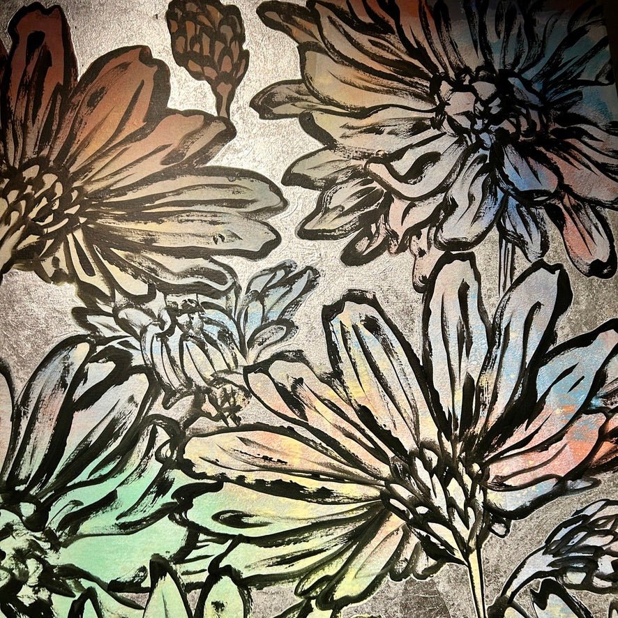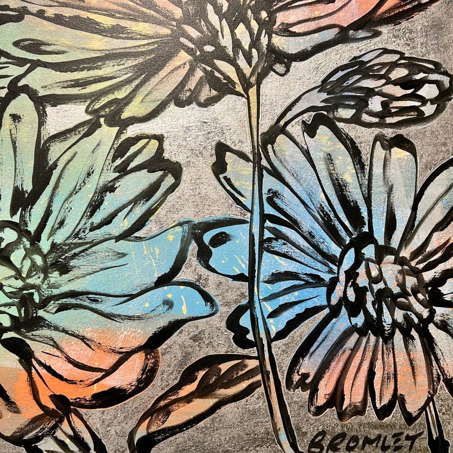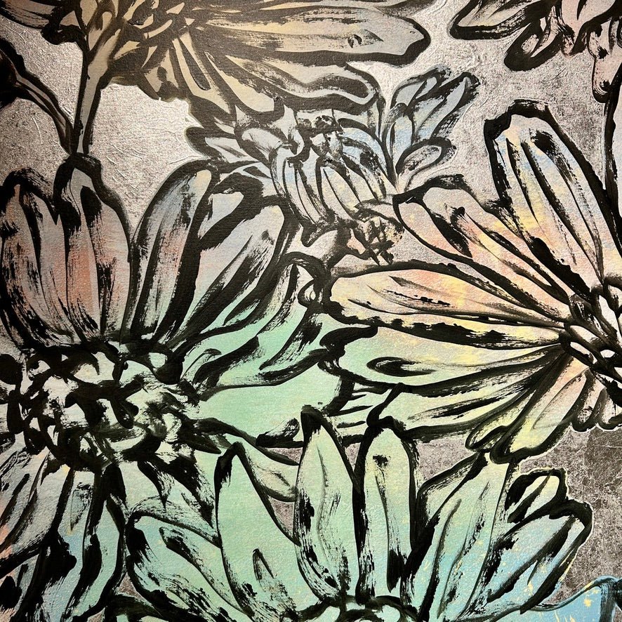 Shipping & ReturnsTerms & ConditionsContactA beautiful floral painting from David Bromley's Nature Series. With a delicate colour palette of soft blues, greens and peachy tones, complimented by a shimmering silver background. Acrylic, oil and silver metal leafing on canvas. 146 x 114cm. This painting is located at our South Yarra gallery.