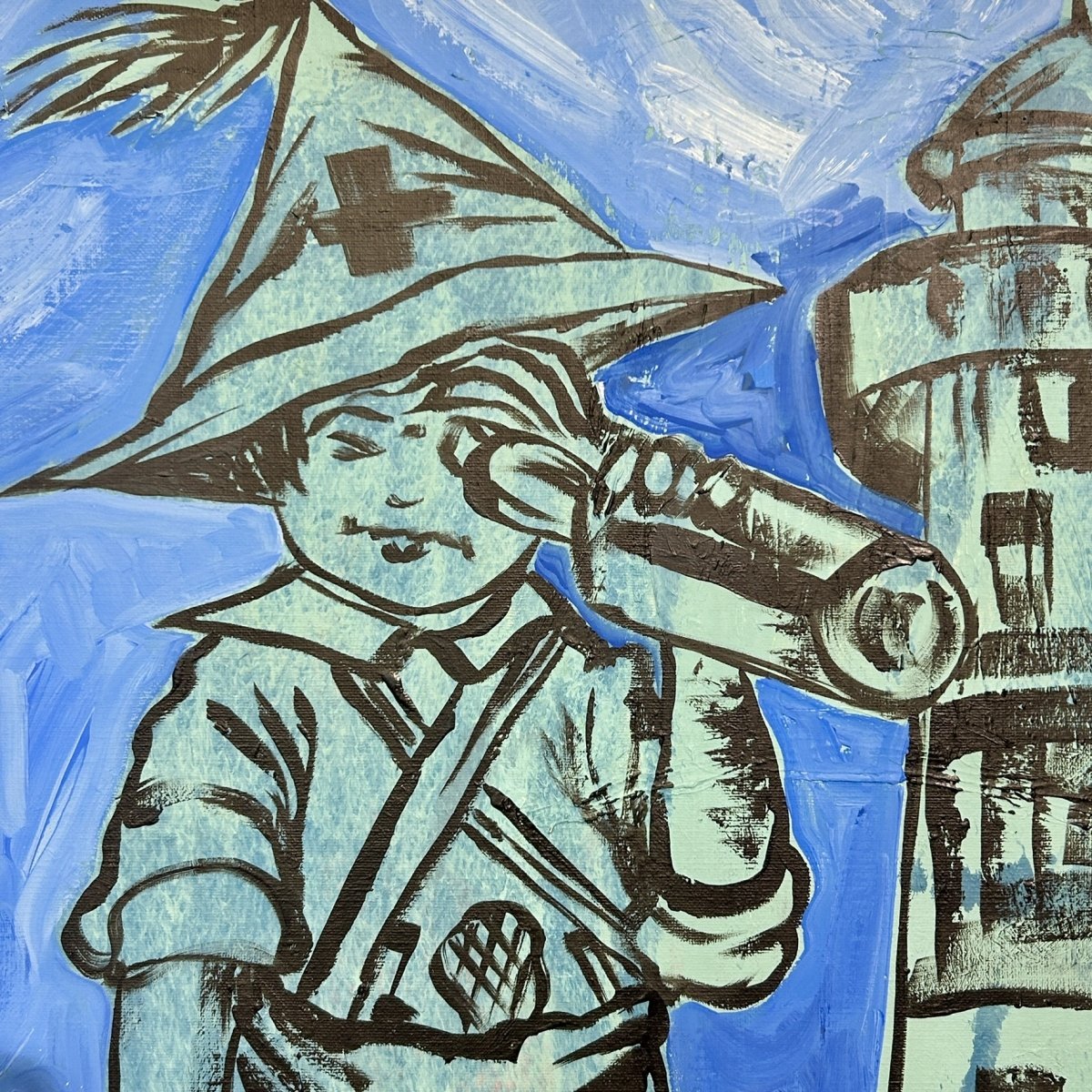 From David Bromley's Children's Series. Painted with a textured background of a sea of blues, complimented by delicate aqua tones to soften the boy and lighthouse.