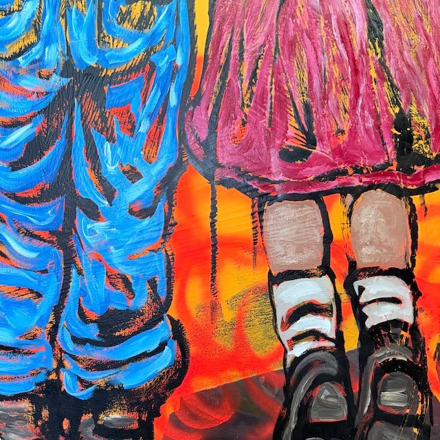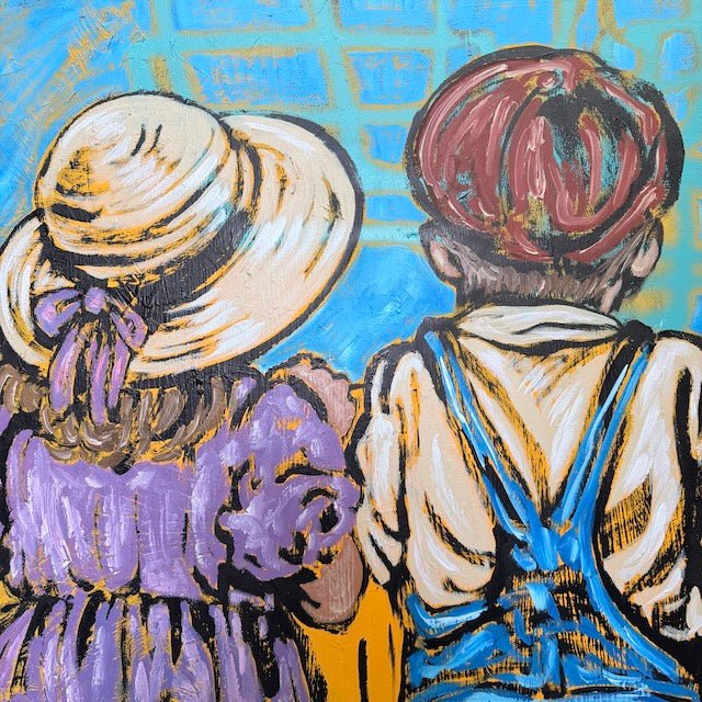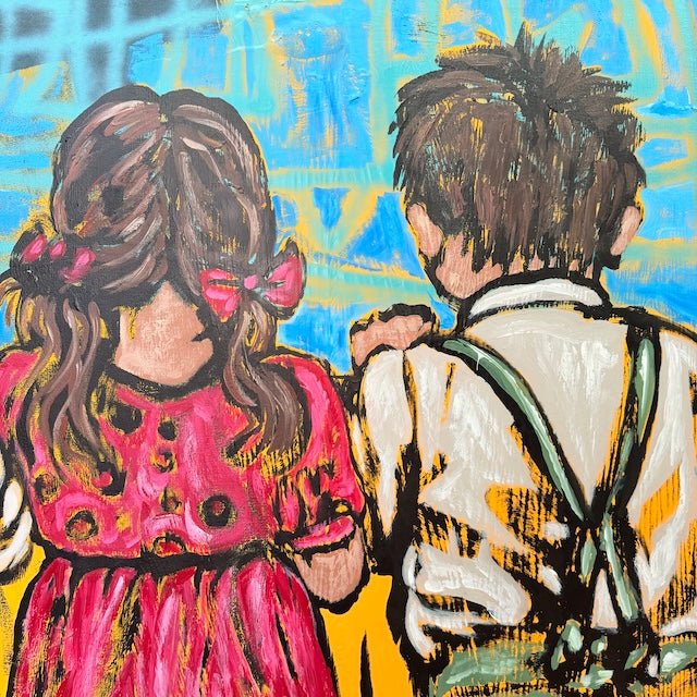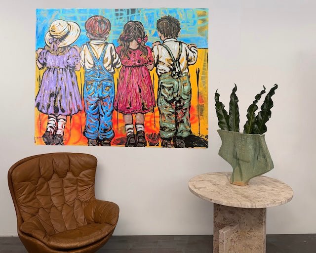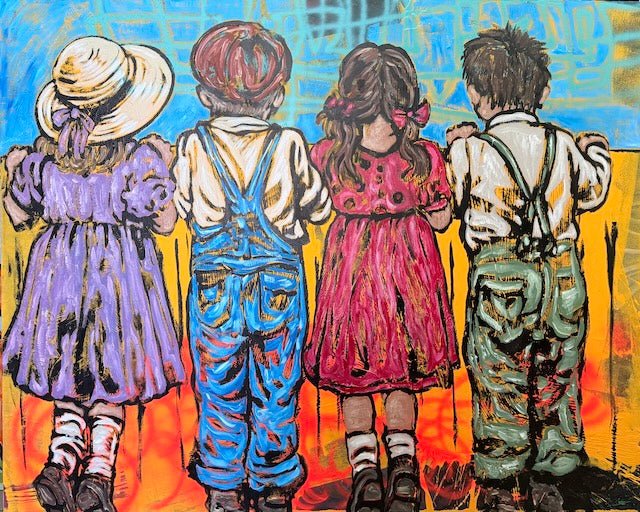 From David Bromley’s Children Series, this vibrant composition depicts four children standing side by side, gazing over a fence. Bold yellows and reds contrast with cool blues, while expressive brushstrokes and strong outlines add texture and depth. The scene captures innocence and unity, celebrating childhood friendship with a lively energy.