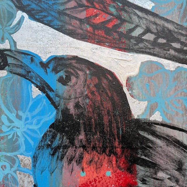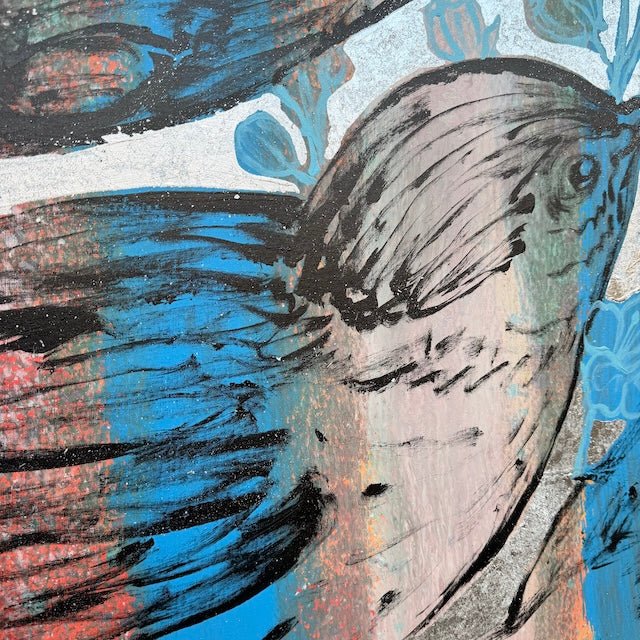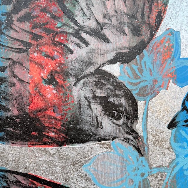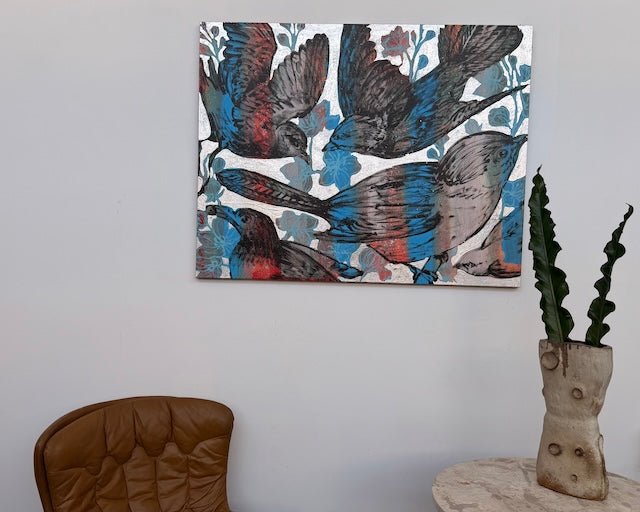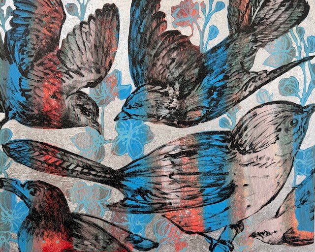 From David Bromley's Nature Series, this bold, textured composition depicts several birds in motion. Vivid blues and bold reds contrast with subtle greys and a shimmering silver background. Expressive brushstrokes and layered details create energy, blending natural forms with delicate linework. To arrange a viewing please click, enquire now.