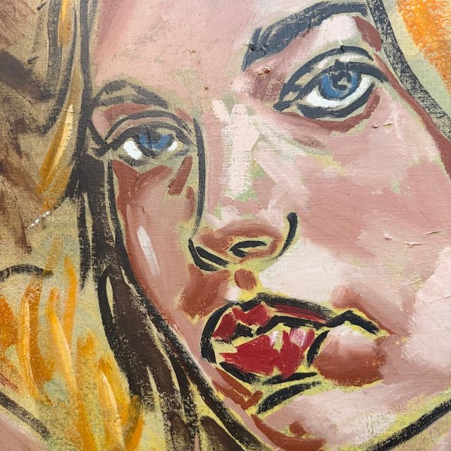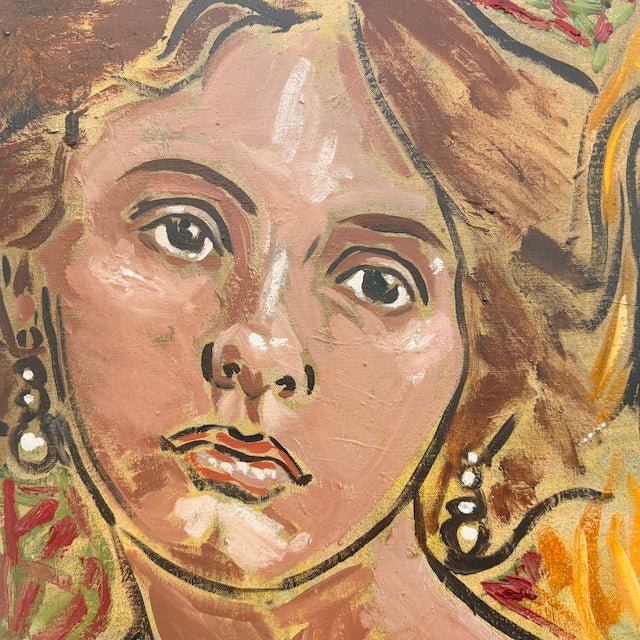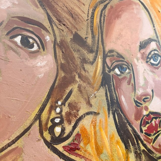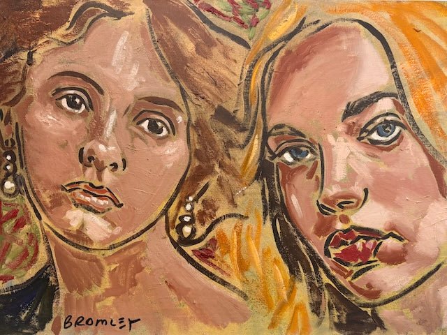 A warm, expressive double portrait capturing intimacy and individuality through bold brushwork and earthy tones. The girls direct gazes and David's textured layers capture a quiet confidence.
