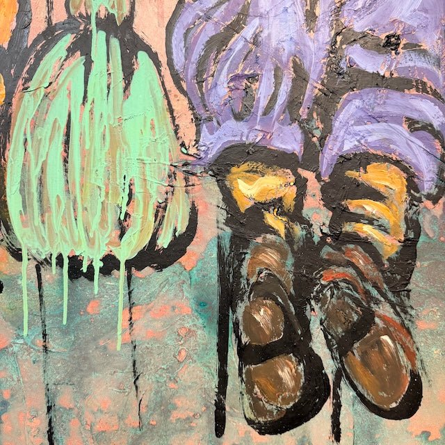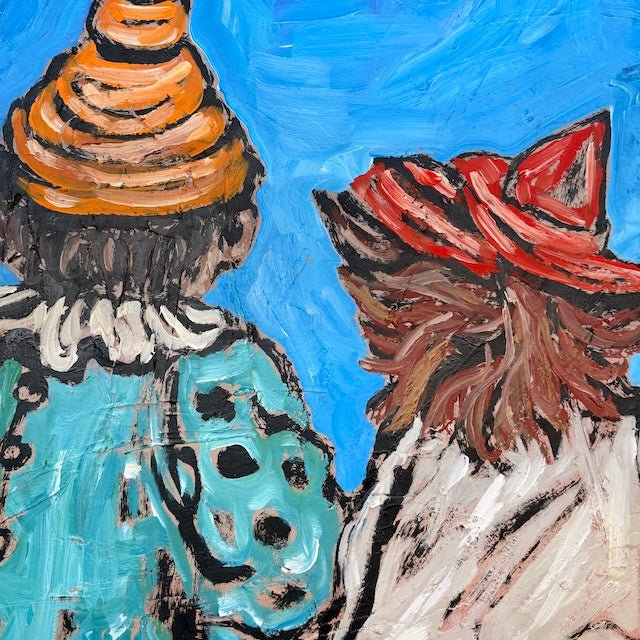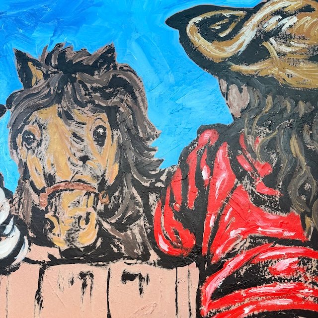 From David Bromley’s Children Series, this lively composition depicts three children leaning over a fence, curiously engaging with a horse. Bright blues, reds, and warm ochres contrast against a soft sky, while bold outlines and textured brushstrokes add depth. The scene captures a sense of wonder, playfulness, and connection with nature.